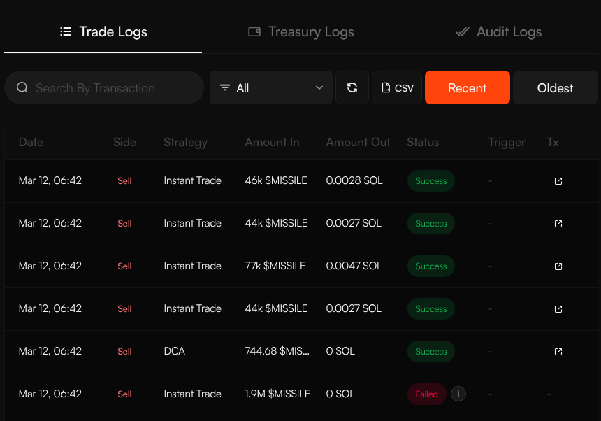- Sort — Click column headers to sort by Date, Amount In, Amount Out, Status, Strategy, or Wallet