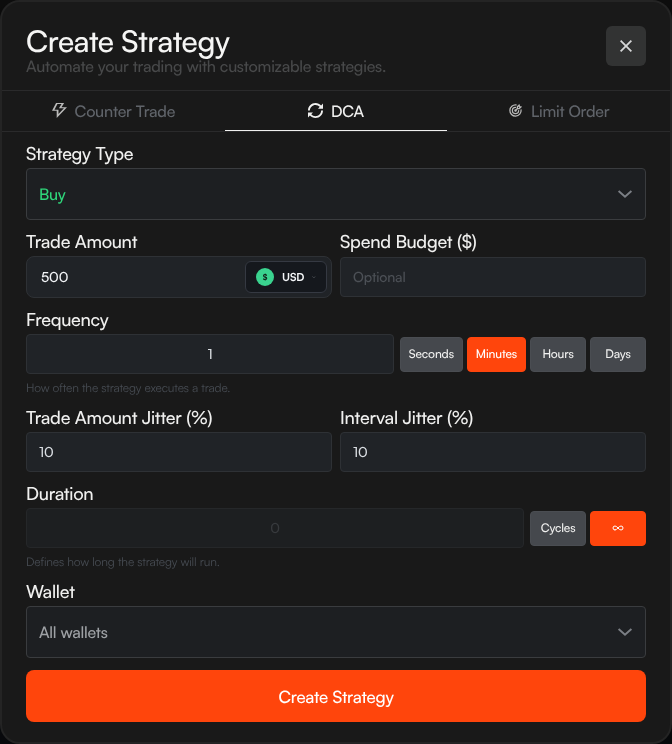 | Interval Jitter (%) | Randomizes the interval by this percentage. E.g. 10% jitter on a 60s interval means trades execute between 54–66 seconds apart. |